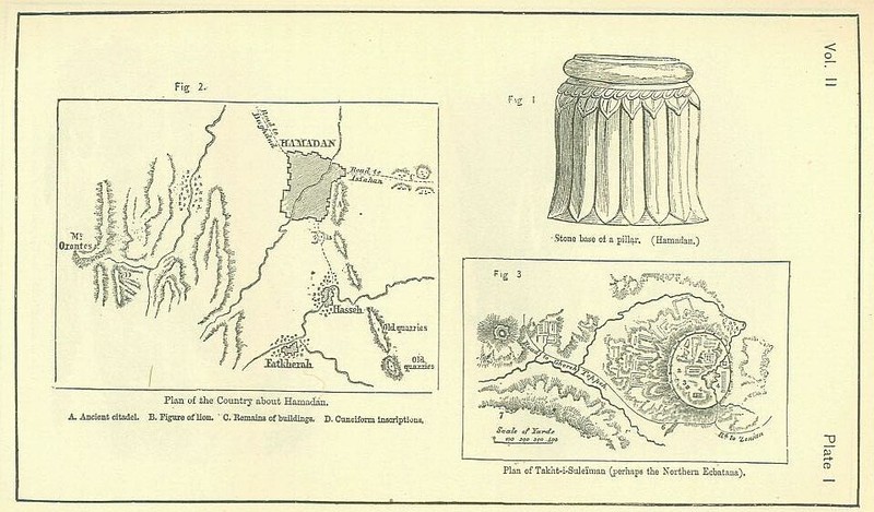 The southern Ecbatana or Agbatana—which the Medes and Persians themselves knew as Hagmatan—was situated, as we learn from Polybius and Diodorus, on a plan at the foot of Mont Orontes, a little to the east of the Zagros range. The notices of these authors, combined with those of Eratosthenes, Isidore, Pliny, Arrian, and others, render it as nearly certain as possible that the site was that of the modern town of Hamadan, the name of which is clearly but a slight corruption of the true ancient appellation. [PLATE I., Fig. 2.] Mount Orontes is to be recognized in the modern Elwend or Erwend—a word etymologically identical with Oront-es—which is a long and lofty mountains standing out like a buttress from the Zagros range, with which it is connected towards the north-west, while on every other side it stands isolated, sweeping boldly down upon the flat country at its base. Copious streams descend from the mountain on every side, more particularly to the north-east, where the plain is covered with a carpet of the most luxuriant verdure, diversified with rills, and ornamented with numerous groves of large and handsome forest trees. It is here, on ground sloping slightly away from the roots of the mountain, that the modern town, which lies directly at its foot, is built. The ancient city, if we may believe Diodorus, did not approach the mountain within a mile or a mile and a half. At any rate, if it began where Hamadan now stands, it most certainly extended very much further into the plain. We need not suppose indeed that it had the circumference, or even half the circumference, which the Sicilian romancer assigns to it, since his two hundred and fifty stades would give a probable area of fifty square miles, more than double that of London! Ecbatana is not likely to have been at its most flourishing period a larger city than Nineveh; and we have already seen that Nineveh covered a space, within the walls, of not more than 1800 English acres.