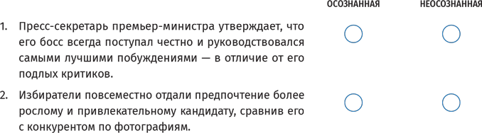 В примере 1 имеет место осознанная предвзятость: пресс-секретарь премьер-министра намеренно и целенаправленно старается представить своего босса с наилучшей стороны, а его критиков характеризует как людей бесчестных. В примере 2 предвзятость является неосознанной. При взгляде на фотографии избиратели симпатизируют рослому и симпатичному кандидату, возможно при этом даже не отдавая себе отчета в том, каким образом его внешность сказывается на их предпочтениях.