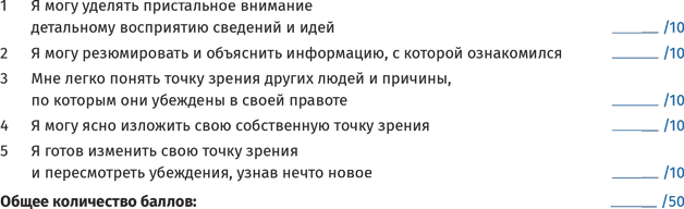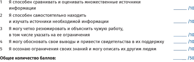 Итак, вы ознакомились с критическим мышлением. Как вы оцениваете свою способность мыслить критически? Ответьте на пять вопросов, выставляя по каждому баллы от 0 до 10, где 10 — «абсолютно уверен», а 0 — «совершенно не уверен».