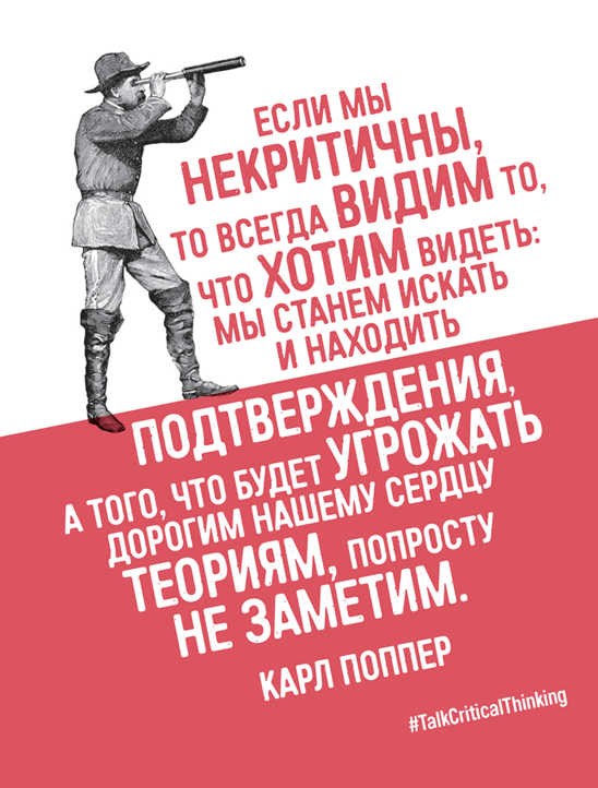 Мы постоянно, не отдавая себе в этом отчета, задействуем критическое мышление или опираемся на полученный с его помощью опыт. Принимая всё на веру, мы бы немногого добились в жизни — вечно обманутые, сбитые с толку, растерянные жертвы манипуляций. Представьте, что вы верили бы любым словам любого человека, всему, что видите, слышите и читаете в каждой рекламе, в каждом политическом заявлении!