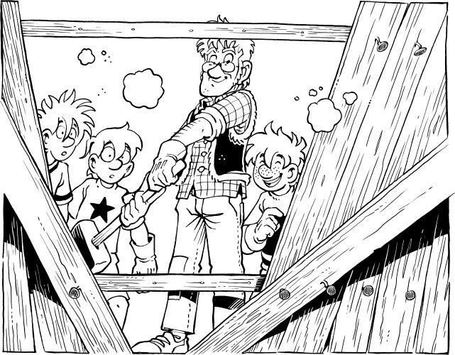 Дядя Титус поднял кувалду и с грохотом ударил ею по одной из деревянных досок. Она тут же оторвалась от поперечной балки. Дядя Титус снял её и отложил в сторону.