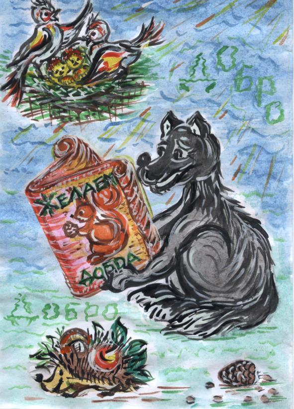 И решил волк найти предназначенное ему добро. Еловой веткой он причесал свой пушистый хвост, лохматый от цепких репьёв, и отправился в путь. Первым повстречался ему пыхтящий от усердия ёжик, тащивший на своих колючках грибы и дикие яблоки. «Не встречалось ли тебе моё добро?» — спросил его волк. «Моё добро приколото ко мне, — отвечал ёжик, — а своё добро сам ищи». Дальше пошёл волк. И услышал, как над его головой птахи зазывно рассвистелись. Задрал волк Вова морду и увидел сияющее гнёздышко, собранное ими из веточек и лучиков. «А вдруг там моё добро?» — подумал он. «Эй, мелкотня, — крикнул волк, — не моему ли добру радуетесь?» «Ой, дружочек, залетай в гости, — развеселились еще больше птахи. — У нас птенчи