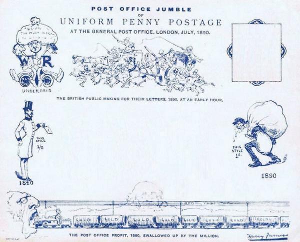 Одновременно изумленные лондонцы увидели в продаже и… пародии, отпечатанные по рисункам популярного в то время карикатуриста Гарри Фурнисса (1854–1925). Основная надпись на конверте была изменена им и представляла не «Юбилей в почтовом ведомстве» (Jubilee…), а «Кавардак в почтовом ведомстве» (Jumble…). Карикатуры на конвертах говорят о том, что волокита поглощает миллионную прибыль, а по утрам при отправке писем возникает страшная давка. Нарисованы и два почтальона: служащий в 1840 году гордо стоит с единственным письмом в руке по тарифу 2/6 шиллинга, а бедняга в 1890 году сгибается под гнетом огромных мешков с дешевыми письмами. Спародирована королевская эмблема в левом верхнем углу конверта – теперь она показывает изнуренных почтовых служащих и имеет подпись «Низкооплачиваемые». Правда, почтовую марку на данном конверте художник нарисовать не решился – это могло расцениваться как подделка государственных знаков оплаты.