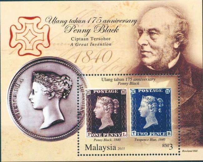 Малайзия, 2015 г. Блок собрал воедино репродукции первых марок, портрет Хилла, оттиск штемпеля, которым чаще всего гасили «Черный пенни», и изображение медальона работы Уильяма Вайона, по которому Фредерик Хит гравировал портрет