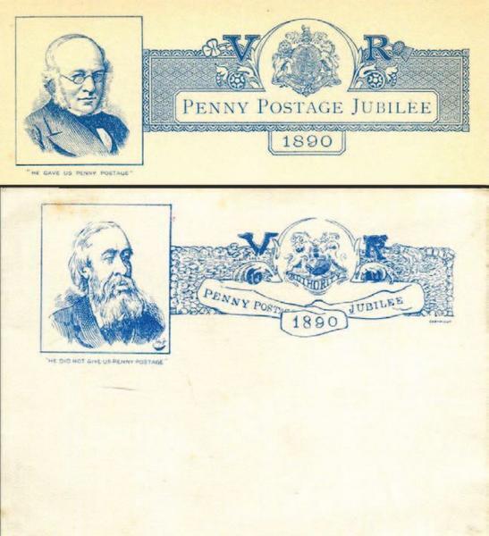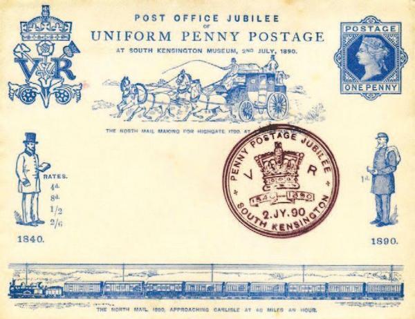 Интересен необычный для того времени комплект: конверт с напечатанной маркой оригинального рисунка номиналом 1 пенни и открытка без марки. Тексты на конверте свидетельствуют о том, что торжества в честь полувекового юбилея почтовой реформы проходили 2 июля 1890 года в музейном городке лондонского Южного Кенсингтона. Рисунки конверта показывают, что в 1790 году почта на лошадях передвигалась со скоростью 8 миль в час, а в 1890-м на поездах – 48 миль в час. Здесь представлены почтальон 1840 года и перечислены некоторые из множества дореформенных тарифов: в 4 и 8 пенсов, 1/2 и 2/6 шиллинга, а также почтальон 1890 года и единый тариф в 1 пенни. На открытке – герб страны, уже знакомая нам аббревиатура VR, юбилейный текст и портрет сэра Роуленда Хилла с подписью: «Он подарил нам пенни-почту».