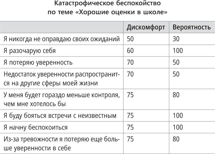 В приведенной ниже таблице (адаптированной из работы Майкла Вейзи и Томаса Борковца) показан еще один пример индивидуальной реакции высокобеспокойного человека на «катастрофическое интервью». На этот раз темой для беспокойства является то, что волнует большинство людей на определенном этапе жизни, — школьные оценки. Авторы исследования попросили участников оценить чувство напряжения в момент интервью (первая колонка, по шкале от 0 до 100, где 0 — совсем не расстроен, а 100 — очень расстроен) и вероятность, с которой, по их мнению, мысль действительно воплотится в жизнь (вторая колонка, по шкале от 0 до 100, где 0 — вряд ли произойдет вообще, а 100 — обязательно произойдет).