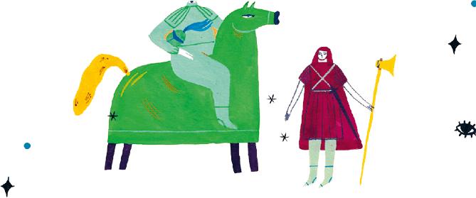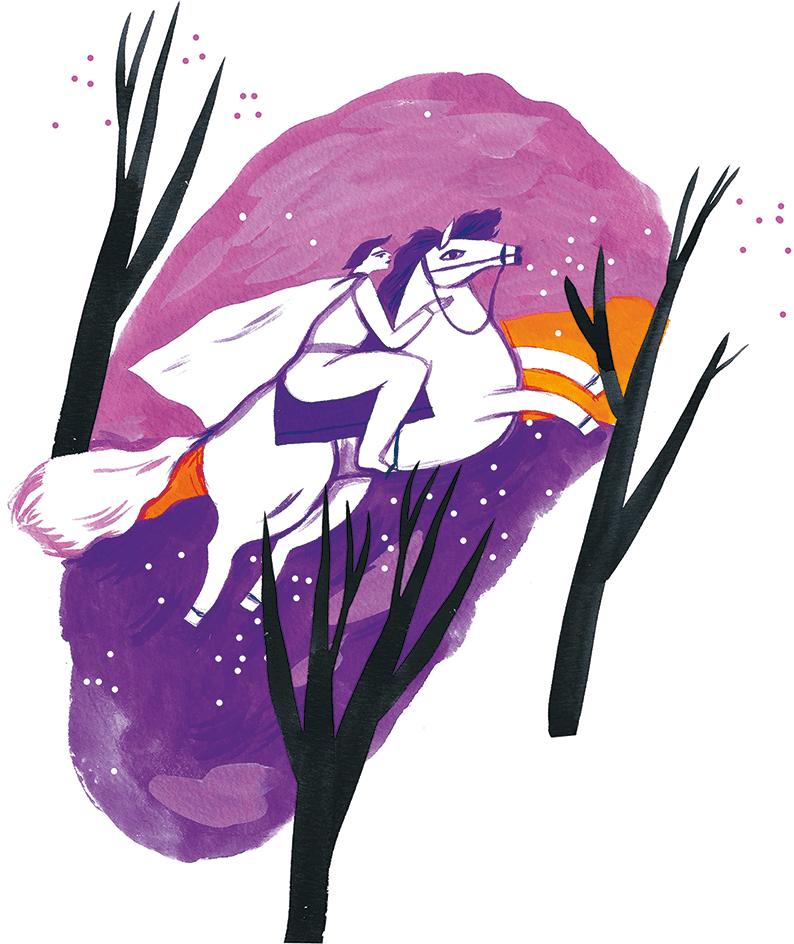 Расхрабрилась Василиса и отправилась к Бабе-яге. Опустилась ночь, лес ожил и наполнился тенями. Вдруг проскакал мимо девушки всадник: весь в белом, на белом скакуне. Глядь, а уж и светать начало…