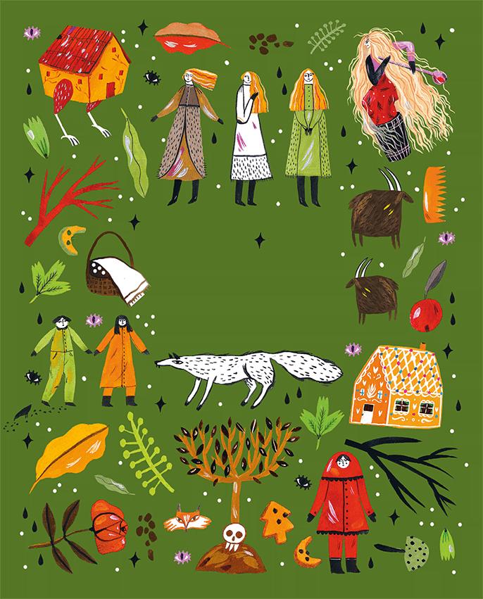 Одна-одинёшенька осталась девушка в непроглядной тьме. Достала она из кармана куколку и угостила её ягодами.