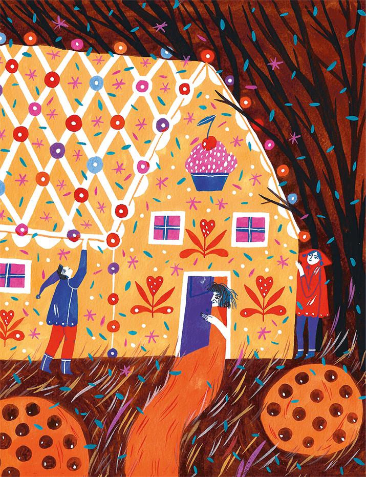 Долго ли, коротко ли бродили Гензель и Гретель по лесу, как поманил их ароматный запах выпечки. На полянке дети увидели домик: стены у него из пряников, а крыша из кексов. Дети отломили по кусочку и того и другого и съели.