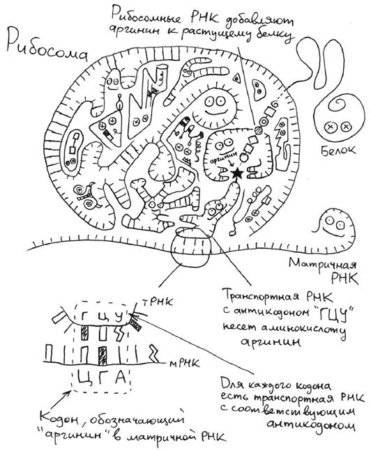 Рибосома — это конгломерат из нескольких десятков молекул, включающих РНК и белки, но первенство в синтезе белка принадлежит именно РНК16. Рибосомная РНК ответственна за самую главную ступень процесса: формирование пептидной связи, то есть связи между двумя аминокислотами в растущей цепи белка. Другая РНК, называемая транспортной, выступает в качестве переносчика аминокислоты. Она подставляет нужную аминокислоту под растущую цепь белка в зависимости от того, какое трехнуклеотидное "слово" в данный момент проходит сквозь рибосому в составе матричной РНК, с которой белок считывается.