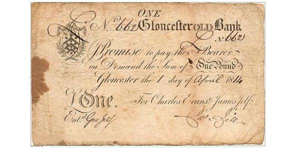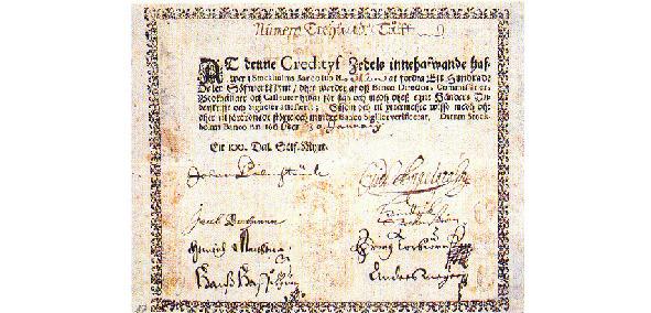 9,10. Первые бумажные (европейские) деньги, банк Стокгольма, 1666 г. Банкноты имеют успех, прежде всего в Англии, где, к тому времени (1694г.) появляется старейший в мире, кредитующий правительство (частный) банк. «Денежная фабрика» массово выпускает купюры достоинством от 5 до 100 фунтов, а также и векселя (как единственно законные платежно-кредитные документы). Здесь (10) приведена купюра образца 1814 года. Дизайн, а также и способ действия этих банкнот довольно схожи. Англия имеет возможность собирать в континентальной Европе военные коалиции, атаковать с их помощью своих врагов, и расплачиваться за их кровь все новыми партиями крашеной бумаги.