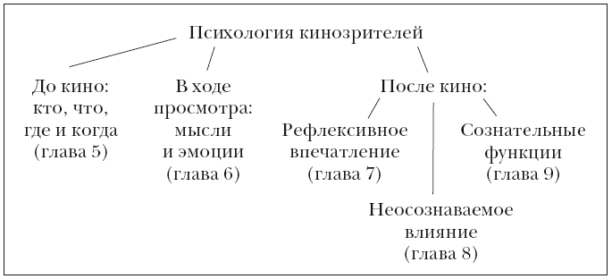 С 5 по 9 главы мы сосредоточимся на другом конце символического спектра – зрителях, взаимодействующих с изображением и звуком. Глава 5 бросает широкий взгляд на аудиторию, чтобы рассмотреть следующие вопросы: какие фильмы смотрят люди? Кто конкретно их смотрит? Где и когда это происходит? Глава 6 расскажет о кинематографическом моменте — процессе, что происходит внутри человека в момент просмотра фильма. Зрители должны воспринять изображения и понять их, чтобы осознать, о чем идет речь. В то же время просмотр фильма вызывает немало эмоций и может спровоцировать сильные чувства, такие как страх, восторг или грусть.