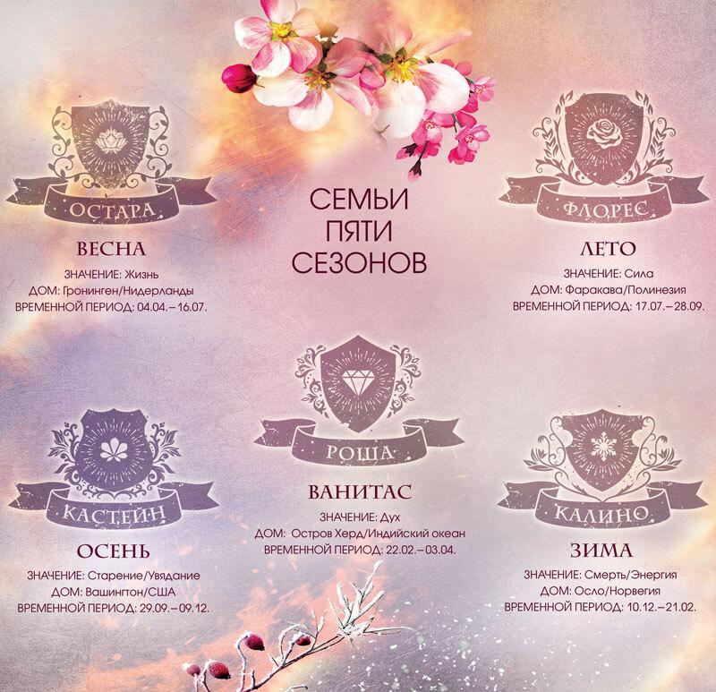 Последовательность течения мира проста: Весна, Лето, Осень, Зима и Ванитас. Так, по крайней мере, было предусмотрено богами, которые передали нам контроль над временами года. Ванитас, пятое время года, другие сезоны в какой-то момент посчитали бесполезным, и члены Ванитас были свергнуты и убиты, а время Ванитас распределено между лидерами восстания: Летом и Зимой. Все это свершилось тысячелетия назад, и несколько недель назад я даже не знала, что этот утраченный сезон вообще когда-либо существовал. Никто больше не говорил об этом, восстание и изгнание Ванитас были просто стерты из памяти и игнорировались, как неприглядное пятно в семейной истории.