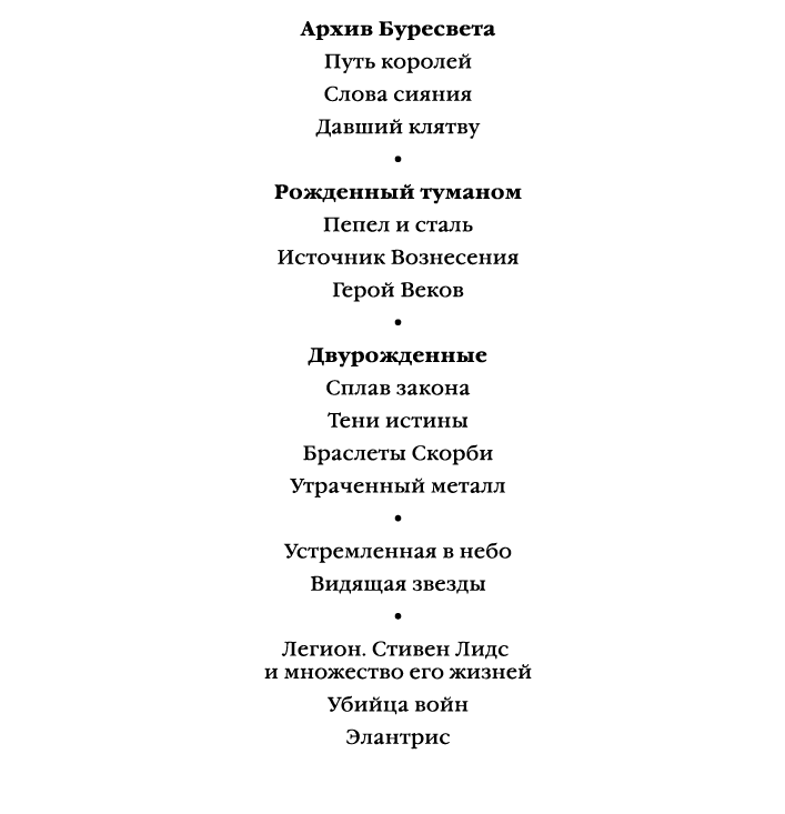 Также нам крайне помогла специальная группа людей, которую я попросил проследить за системой магии и сообщать мне, когда требуются более подробные объяснения или в случаях, если я противоречу сам себе. Мы назвали эту группу «Команда Магической Последовательности», но в дальнейшем я буду именовать их просто «Арканистами». Это Джошуа Харки, Эрик Лейк, Евгений Кирилов, Дэвид Беренс, Иэн Макнатт и Бен Мэрроу.