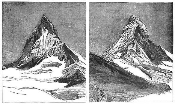 § 8. My first object was to reach some spot commanding, as nearly as might be, the lateral profile of the Mont Cervin. The most available point for this purpose was the top of the Riffelhorn; which, however, first attempting to climb by its deceitful western side, and being stopped, for the moment, by the singular moat and wall which defend its Malakhoff-like summit, fearing that I might not be able ultimately to reach the top, I made the drawing of the Cervin, on the left hand in Plate 38, from the edge of the moat; and found afterwards the difference in aspect, as it was seen from the true summit, so slight as not to necessitate the trouble of making another drawing.83
