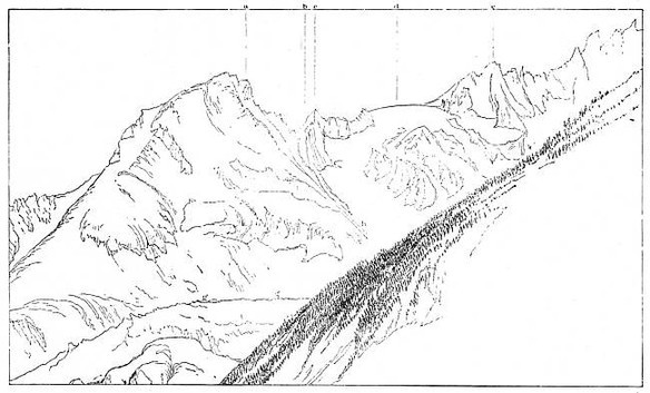 81 The contour of the whole cliff, seen from near its foot as it rises above the shoulder of the Breven, is as at Fig. 76 opposite. The part measured is a d; but the precipice recedes to the summit b, on which a human figure is discernible to the naked eye merely as a point. The bank from which the cliff rises, c, recedes as it falls to the left; so that five hundred feet may perhaps be an under-estimate of the height below the summit. The straight sloping lines are cleavages, across the beds. Finally, Fig. 4, Plate 25, gives the look of the whole summit as seen from the village of Chamouni beneath it, at a distance of about two miles, and some four or five thousand feet above the spectator. It appears, then, like a not very formidable projection of crag overhanging the great slopes of the mountain's foundation.