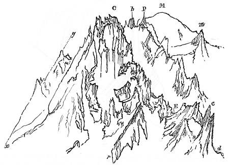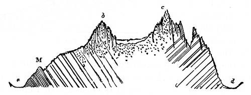 73 I tried in vain to get along the ridge of the Bouchard to this junction, the edge of the precipice between a and b (Plate 33) being too broken; but the point corresponds so closely to that of the junction of the gneiss and protogine on the Charmoz ridge, that, adding the evidence of the distant contour, I have no doubt as to the general relations of the rocks.