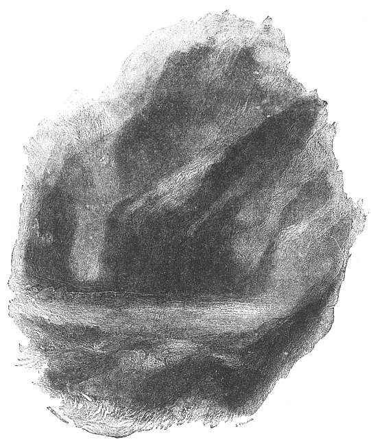 § 28. Now, it not unfrequently happens that in Claude's distances he introduces actual outlines of Capri, Ischia, Monte St. Angelo, the Alban Mount, and other chains about Rome and Naples, more or less faithfully copied from nature. When he does so, confining himself to mere outline, the grey contours seen against the distance are often satisfactory enough; but as soon as he brings one of them nearer, so as to require any drawing within its mass, it is quite curious to see the state of paralysis into which he is thrown for want of any perception of the mountain anatomy. Fig. 68 is one of the largest hills I can find in the Liber Veritatis (No. 86), and it will be seen that there are only a few lines inserted towards the edges, drawn in the direction of the sides of the heap, or cone, wholly without consciousness of any interior structure.