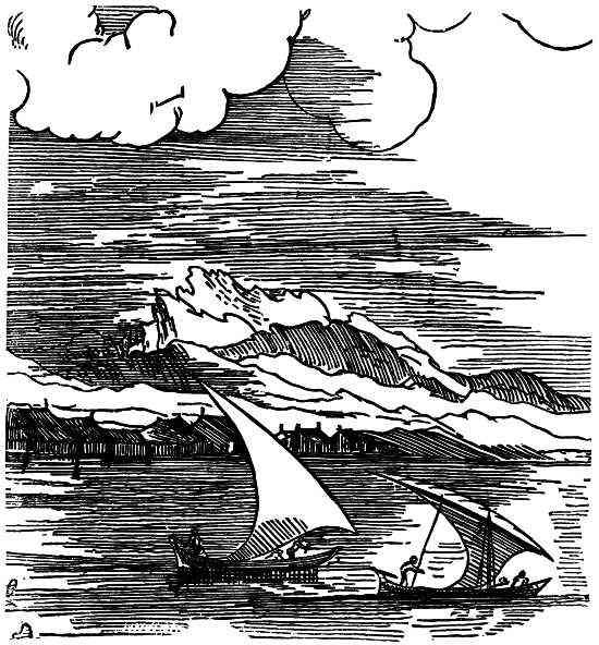 § 27. The next figure (66) is interesting because it furnishes one of the few instances in which Titian definitely took a suggestion from the Alps, as he saw them from his house at Venice. It is from an old print of a shepherd with a flock of sheep by the sea-side, in which he has introduced a sea distance, with the Venetian church of St. Helena, some subordinate buildings resembling those of Murano, and this piece of cloud and mountain. The peak represented is one of the greater Tyrolese Alps, which shows itself from Venice behind an opening in the chain, and is their culminating point. In reality the mass is of the shape given in Fig. 67. Titian has modified it into an energetic crest, showing his feeling for the form, but I have no doubt that the woodcut reverses Titian's original work (whatever it was), and that he gave the crest the true inclination to the right, or east, which it has in nature.