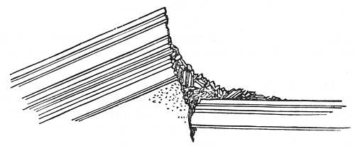 § 4. It occasionally happens that a precipice is formed among the higher crests by the sides of vertical beds of slaty crystallines. Such rocks are rare, and never very high, but always beautiful in their smoothness of surface and general trenchant and firm expression. One of the most interesting I know is that of the summit of the Breven, on the north of the valley of Chamouni. The mountain is formed by vertical sheets of slaty crystallines, rather soft at the bottom, and getting harder and harder towards the top, until at the very summit it is hard and compact as the granite of Waterloo Bridge, though much finer in the grain, and breaking into perpendicular faces of rock so perfectly cut as to feel smooth to the hand. Fig. 4, p. 107, represents, of the real size, a bit which I broke from the edge of the cliff, the shaded part underneath being the surface which forms the precipice. The plumb-line from the brow of this cliff hangs clear 124 English feet; it is then caught by a ledge about three feet wide, from which another precipice falls to about twice the height of the first; but I had not line enough to measure it with from the top, and could not get down to the ledge. When I say the line hangs clear, I mean when once it is off the actual brow of the cliff, which is a little rounded for about fourteen or fifteen feet, from a to b, in the section, Fig. 75. Then the rock recedes in an almost unbroken concave sweep, detaching itself from the plumb-line about two feet at the point c (the lateral dimensions are exaggerated to show the curve), and approaching it again at the ledge d, which is 124 feet below a. The plumb-line, fortunately, can be seen throughout its whole extent from a sharp bastion of the precipice farther on, for the face of the cliff runs, in horizontal plan, very nearly to the magnetic north and south, as shown in Fig. 74, the plumb-line swinging at a, and seen from the advanced point P. It would give a similar result at any other part of the cliff face, but may be most conveniently cast from the point a, a little below, and to the north of the summit.