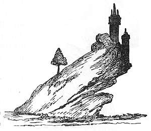 § 35. In fact, as I said some time ago, the whole landscape of Claude was nothing but a more or less softened continuance of the old traditions of missal-painting, of which I gave examples in the previous volume. The general notion of rock which may be traced in the earliest work, as Figs. 1 and 2 in Plate 10 Vol. III. is of an upright mass cut out with an adze; as art advances, the painters begin to perceive horizontal stratification, and, as in all the four other examples of that plate, show something like true rendering of the fracture of rocks in vertical joints with superimposed projecting masses. They insist on this type, thinking it frowning or picturesque, and usually exhibit it to more advantage by putting a convent, hermitage, or castle on the projection of the crag. In the blue backgrounds of the missals the projection is often wildly extravagant; for instance, the MS. Additional, 11,696 Brit. Mus., has all its backgrounds composed of blue rocks with towers upon them, of which Fig. 85 is a characteristic example (magnified in scale about one-third; but, I think, rather diminished in extravagance of projection). It is infinitely better drawn than Claude's rocks ever are, in the expression of cleavage; but certainly somewhat too bold in standing. Then, in more elaborate work, we get conditions of precipice like Fig. 3 in Plate 10, which, indeed, is not ill-drawn in many respects; and the book from which it is taken shows other evidences of a love of nature sufficiently rare at the period, though joined quaintly with love of the grotesque: for instance, the writer, giving an account of the natural productions of Saxony, illustrates his chapter with a view of the salt mines; he represents the brine-spring, conducted by a wooden trough from the rock into an evaporating-house where it is received in a pan, under which he has painted scarlet flames of fire with singular skill; and the rock out of which the brine flows is in its general cleavages the best I ever saw drawn by mediæval art. But it is carefully wrought to the resemblance of a grotesque human head.