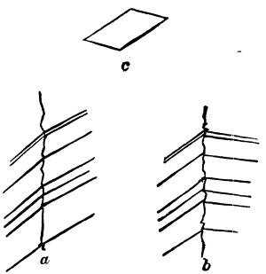 Examine, then, the plate just given (12 A). The cleavage of the shales runs diagonally up from left to right; note especially how delicately it runs up through the foreground rock, and is insisted upon, just at the brow of it, in the angular step-like fragments; compare also the etching in the first volume. Then note the upright pillars in the distance, marked especially as rhomboidal by being drawn with the cleavage still sloping up on the returning side, as at a, Fig. 83, not as at b, which would be their aspect if they were square; and then the indication of interruption in the structure at the brow of the main cliff, where, as well as on the nearer mass, exposure to the weather has rounded away the cleavages.