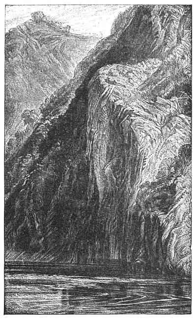 On the opposite shore is a singular jutting angle of the shales, forming the principal feature of the low cliffs at the water's edge. Turner fastens on it as the only available mass; draws it with notable care, and then magnifies it, by diminishing the trees on its top to one fifth of their real size, so that what would else have been little more than a stony bank becomes a true precipice, on a scale completely suggestive of the heights behind. The hill beyond is in like manner lifted into a more rounded, but still precipitous, eminence, reaching the utmost admissible elevation of ten or twelve hundred feet (measurable by the trees upon it). I have engraved this entire portion of the drawing of the real size, on the opposite page; the engraving of the whole drawing, published in the England Series, is also easily accessible.