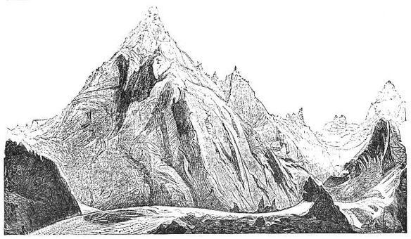 § 12. The only portion of the Matterhorn which approaches such a condition is the shoulder, before alluded to, forming a step of about one twelfth the height of the whole peak, shown by light on its snowy side, or upper surface, in the right-hand figure of Plate 38. Allowing 4000 feet for the height of the peak, this step or shoulder will be between 300 and 400 feet in absolute height; and as it is not only perpendicular, but assuredly overhangs, both at this snow-lighted angle and at the other corner of the mountain (seen against the sky in the same figure), I have not the slightest doubt that a plumb-line would swing from the brow of either of these bastions, between 600 and 800 feet, without touching rock. The intermediate portion of the cliff which joins them is, however, not more than vertical. I was therefore anxious chiefly to observe the structure of the two angles, and, to that end, to see the mountain close on that side, from the Zmutt glacier.
