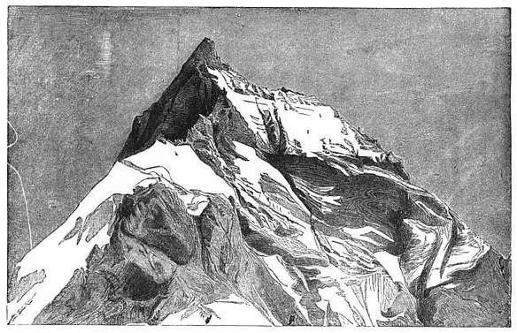 Seen from this spot, it seems impossible that the mountain should long support itself in such a form, but the impression is only caused by the concealment of the vast proportions of the mass behind, whose poise is quite unaffected by this hollowing at one point. Thenceforward, as we ascend the glacier, the Matterhorn every moment expands in apparent width; and having reached the foot of the Stockhi (about a four hours' walk from Zermatt), and getting the Cervin summit to bear S. 11-½° E., I made the drawing of it engraved opposite, which gives a true idea of the relations between it and the masses of its foundation. The bearing stated is that of the apparent summit only, as from this point the true summit is not visible; the rocks which seem to form the greatest part of the mountain being in reality nothing but its foundations, while the little white jagged peak, relieved against the dark hollow just below the seeming summit, is the rock marked g in Fig. 33. But the structure of the mass, and the long ranges of horizontal, or nearly horizontal, beds which form its crest, showing in black points like arrow-heads through the snow, where their ridges are left projecting by the avalanche channels, are better seen than at any other point I reached, together with the sweeping and thin zones of sandy gneiss below, bending apparently like a coach-spring; and the notable point about the whole is, that this under-bed, of seemingly the most delicate substance, is that prepared by Nature to build her boldest precipice with, it being this bed which emerges at the two bastions or shoulders before noticed, and which by that projection causes the strange oblique distortion of the whole mountain mass, as it is seen from Zermatt.