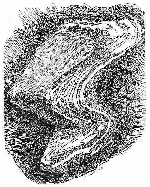 71 Nor did any nearer observations ever induce me to form any contrary opinion. It is not easy to get any consistent series of measurements of the slope of these gneiss beds; for, although parallel on the great scale, they admit many varieties of dip in minor projections. But all my notes unite, whether at the bottom or top of the great slope of the Montanvert and La Côte, in giving an angle of from 60° to 80° with the horizon; the consistent angle being about 75°. I cannot be mistaken in the measurements themselves, however inconclusive observations on minor portions of rock may be; for I never mark an angle unless enough of the upper or lower surface of the beds be smoothly exposed to admit of my pole being adjusted to it by the spirit-level. The pole then indicates the strike of the beds, and a quadrant with a plumb-line their dip; to all intents and purposes accurately. There is a curious distortion of the beds in the ravine between the Glacier des Bois and foot of the Montanvert, near the ice, about a thousand feet above the valley; the beds there seem to bend suddenly back under the glacier, and in some places to be quite vertical. On the opposite side of the glacier, below the Chapeau, the dip of the limestone under the gneiss, with the intermediate bed, seven or eight feet thick, of the grey porous rock which the French call cargneule, is highly interesting; but it is so concealed by débris and the soil of the pine forests, as to be difficult to examine to any extent. On the whole, the best position for getting the angle of the beds accurately, is the top of the Tapia, a little below the junction there of the granite and gneiss (see notice of this junction in Appendix 2); a point from which the summit of the Aiguille du Gouté bears 11° south of west, and that of the Aiguille Bouchard 17° north of east, the Aiguille Dru 5-½° or 6° north of east, the peak of it appearing behind the Petit Charmoz. The beds of gneiss emerging from the turf under the spectator's feet may be brought parallel by the eye with the slopes of the Aiguille du Gouté on one side, and the Bouchard (and base of Aiguille d'Argentière) on the other; striking as nearly as possible from summit to summit through that on which the spectator stands, or from about 10° north of east to 10° south of west, and dipping with exquisite uniformity at an angle of 74 degrees with the horizon. But what struck me as still more strange was, that from this point I could distinctly see traces of the same straight structure running through the Petit Charmoz, and the roots of the aiguilles themselves, as in Fig. 59; nor could I ever, in the course of countless observations, fairly determine any point where this slaty structure altogether had ceased. It seemed only to get less and less traceable towards the centre of the mass of Mont Blanc; and, from the ridge of the Aiguille Bouchard itself, at the point a in Plate 33, whence, looking south-west, the aiguilles can be seen in the most accurate profile obtainable throughout the valley of Chamouni, I noticed a very singular parallelism even on the south-east side of the Charmoz, x y (Fig. 60), as if the continued influence of this cleavage were carried on from the Little Charmoz, c, d (in which, seen on the opposite side, I had traced it as in Fig. 59), through the central mass of rock r. In this profile, M is the Mont Blanc itself; m, the Aiguille du Midi; P, Aiguille du Plan; b, Aiguille Blaitière; C, Great Charmoz; c, Petit Charmoz; E, passage called de l'Etala.