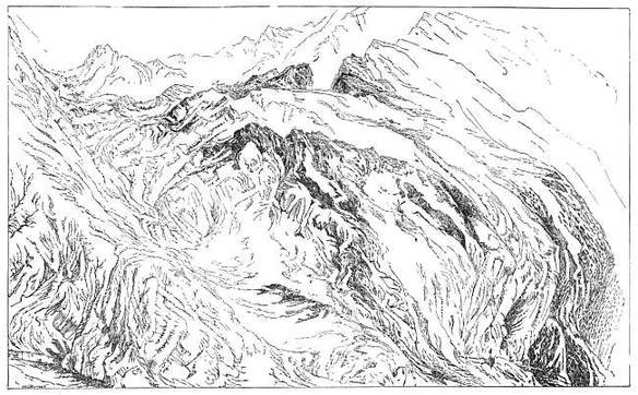 75 The aqueous curves and roundings on the nearer crest (La Côte) are peculiarly tender, because the gneiss of which it is composed is softer in grain than that of the Bouchard, and remains so even to the very top of the peak, a, in Fig. 61, where I found it mixed with a yellowish and somewhat sandy quartz rock, and generally much less protogenic than is usual at such elevations on other parts of the chain.