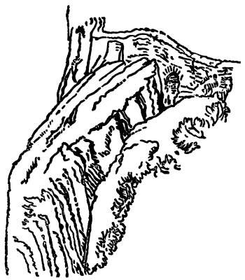 § 29. I put below it, outlined also in the rudest way (for as I take the shade away from the Liber Veritatis, I am bound also to take it away from Turner), Fig. 69, a bit of the crags in the drawing of Loch Coriskin, partly described already in § 5 of the chapter on the Inferior Mountains in Vol. I. The crest form is, indeed, here accidentally prominent, and developed to a degree rare even with Turner; but note, besides this, the way in which Turner leans on the centre and body of the hill, not on its edge; marking its strata stone by stone, just as a good figure painter, drawing a limb, marks the fall and rise of the joint, letting the outline sink back softened; and compare the exactly opposite method of Claude, holding for life to his outline, as a Greek navigator holds to the shore.76