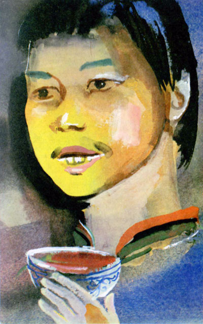 Вскоре после этого гостям подали чай в чашках с острым конусообразным дном. Ламы, не находя места, на что поставить диковинные чашки, пили чай, торопясь, обжигая руки, и вскоре отказались от чая.