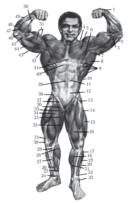 1 – шиловидный отросток лучевой кости; 2 – связка трехглавой мышцы; 3 – межмышечная перегородка; 4 – большая грудная мышца; 5 – ключичная часть; 6 – грудинная часть; 7 – большая круглая мышца; 8 – широчайшая мышца спины; 9 – передняя зубчатая мышца; 10 – косая наружная мышца живота; 11 – прямая мышца живота; 12 – апоневроз; 13 – мышца, напрягающая широкую фасцию бедра; 14 – прямая мышца бедра; 15 – боковая мышца бедра; 16 – средняя мышца бедра; 17 – длинная малоберцовая мышца; 18 – икроножная мышца; 19 – передняя большеберцовая мышца; 20 – длинный разгибатель пальцев; 21 – камбаловидная мышца; 22 – передний удерживатель сухожилий мышц-разгибателей; 23 – боковая лодыжка; 24 – средняя лодыжка; 25 – ахиллово сухожилие; 26 – длинный сгибатель пальцев стопы; 27 – большеберцовая кость; 28 – полуперепончатая мышца; 29 – сухожильное расширение; 30 – коленная чашечка; 31 – коленная связка; 32 – нежная мышца; 33 – длинная приводящая мышца бедра; 34 – портняжная мышца; 35 – гребешковая мышца; 36 – подвздошно-поясная мышца; 37 – паховая связка; 38 – передняя ость подвздошной кости; 39 – белая линия живота; 40 – граница ребер; 41 – грудинная линия; 42 – клювоплечевая мышца; 43 – длинная головка; 44 – трехглавая мышца плеча; 45 – плечевая мышца; 46 – круглый пронатор; 47 – локтевой отросток; 48 – лучевой сгибатель кости; 49 – локтевой сгибатель кости; 50 – длинный разгибатель пальцев; 51 – короткая головка