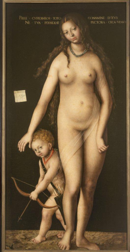 Начнем с того, что это первое изображение обнаженной богини в немецкой живописи. Смело? Безусловно. Опасно? Несомненно. Возможно, именно с этим связан морализаторский тон надписи и поза богини, которая как будто пытается удержать своего взбалмошного сына, говоря ему: «Нет, дорогой, этот человек – благопристойный христианин, он не годится для того, чтобы стать мишенью».