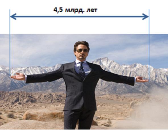 Хочу успокоить — это не утренняя зарядка. Кончик правого пальца — это условное время зарождения планеты Земля. Кончик ноготка левого среднего пальца — сегодняшний день, двадцать первый век. Ваши вытянутые руки образно выражают время существования Земли. Мысленно нанесем на руки и тело цифры. Итак, ноготок правого пальца — 4,5 миллиарда лет тому назад. Земля только что появилась. Горячая, бурлящая, пока неживая. Ближе к локтю Земле около миллиарда лет, она остыла, покрылась мантией. Движемся взглядом по руке дальше. Правое плечо — возникновение на земле клеточной жизни. Проскакиваем всё тело от подмышки до подмышки, вплоть до локтя левой руки — протерозойская эра. Земле уже 3,5 миллиарда лет, появляются беспозвоночные. Запястье левой руки (600 миллионов лет до нашей эры) — костные рыбы, амфибии. В середине ладошки — млекопитающие. А вот вторая фаланга среднего пальца левой руки! 65 миллионов лет тому назад здесь исчезают динозавры. И наконец!!! Вот здесь, под ноготком, — появление человека! Этого царя природы! Хозяина вселенной! Идем дальше, но уже с лупой в руках. Ближе к концу ноготка — средний каменный век, появились у человека лук и стрелы, и уж совсем на кончике ноготка — календарь майя, это около 11 тысяч лет до нашей эры. Сегодня пилкой вы поправили ноготок и срезали последний потоп, 4 тысячи лет до нашей эры. И Юлия Цезаря — он погиб за полвека до нашей эры. Одним движением пилки вы срезали тысячелетия. Человек-то, оказывается, с ноготок!!!