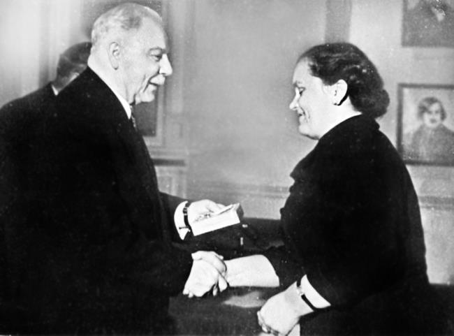 К.Е. Ворошилов вручает В.В. Ганкевич орден «Знак Почета». 1955 г.