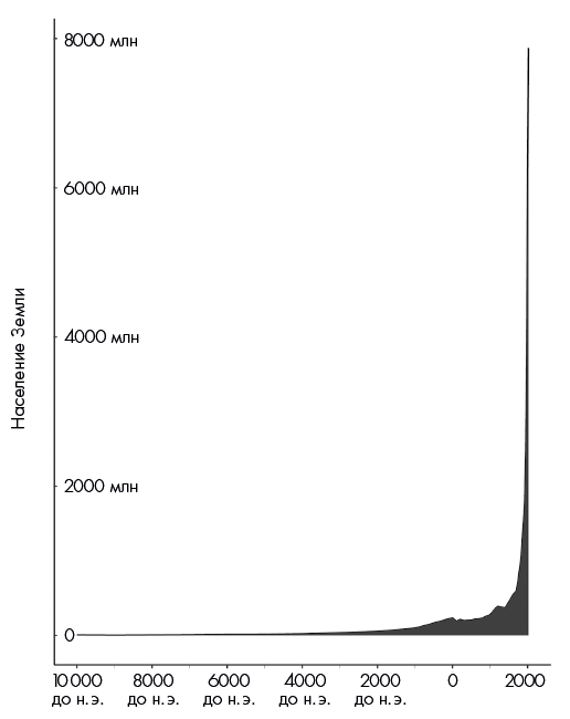 Рис. 1.1. Рост численности людей за последние 12 000 лет. Считается, что ранее, то есть до 10 000 года до н.э., численность всего человечества никогда не превышала 100 000: такая цифра на данном графике не отразилась бы.