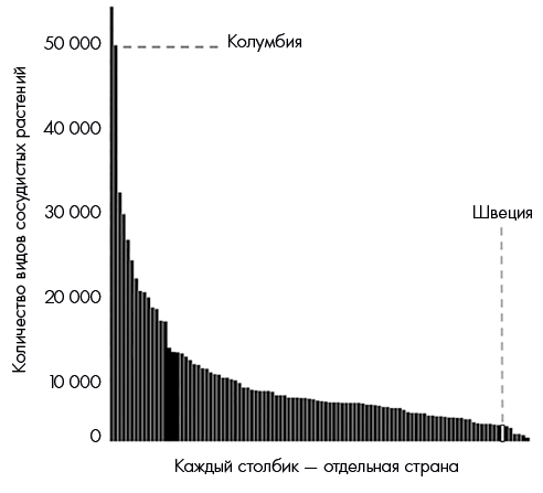 Рис. 1.2. Количество видов сосудистых растений в 103 странах. Отметим, что по разнообразию растений Швеция — одна из самых биологически однообразных стран. К примеру, в Колумбии, которая больше Швеции всего вдвое, видов растений примерно в 20 раз больше. Тот же паттерн проявляет себя и в разнообразии птиц, млекопитающих и иных растений