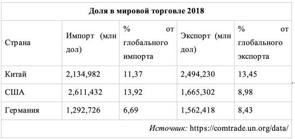 Формально, экспорт продолжал быть очень высоким. КНР в 2019 году экспортировала товаров по всему миру на сумму 2,499 трлн. дол, что с одной стороны, отражает рост на 9,9% по сравнению с 2015 годом, но, с другой стороны, это лишь скромное увеличение на 0,2% с 2018 по 2019 год. При этом по ряду товаров в 2019 г.произошло снижение экспорта, так экспорт системных устройств и телефонов, включая смартфоны, упал на 6,8%, компьютерных комплектующих и аксессуаров на 28,4%, плоского стального проката на 16,8% и т.д.. При этом объем ежегодного китайского экспорта превышает сумму, которую он импортирует из остального мира, то есть у Китая практически со всеми странами — положительно сальдо (с Россией — отрицательное), причем большая часть профицита Китая приходится на торговлю с США и Гонконгом. Всего же торговля Китая составляла в 2018 г. 11,37% от мирового импорта и 13,45% мирового экспорта.