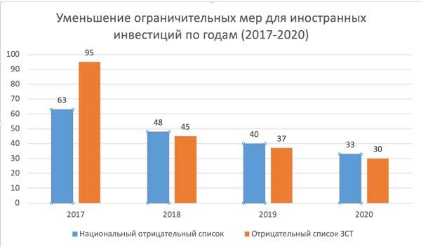 Заметно уменьшается и список секторов, куда иностранцы до этого не имели права направлять инвестиции и вести в них деятельность - так называемые «отрицательные списки». Всего существует два таких списка: один «Национальный отрицательный список» и «Отрицательный список Зон свободной торговли», которые регулярно обновляются. Например, по сравнению с отрицательными списками 2019 года в новом Национальном отрицательном списке от 2020 года (вступил в силу с 23 июля 2020 г.) число ограниченных для деятельности иностранцев секторов сократилось на 17,5% с 40 до 33, а в новом Отрицательном списке ЗСТ на 18,9% с 37 до 30 ограниченных областей.