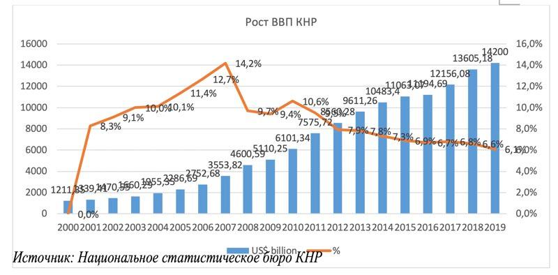 В абсолютных цифрах прирост ВВП продолжался уже с 1991 г. (было лишь небольшое снижение в 2016 г.), но сами темпа роста с 2011 г. замедлялись. С середины 2018 г. Китай был втянут в торговое противостояние с США, которое завершилось «первой фазой» сделки — она обязывала Китай закупить в США в течение двух лет американских товаров на 200 млрд долл. Причем закупить в безальтернативном порядке, «отодвинув», очевидно, многих других своих партнёров.