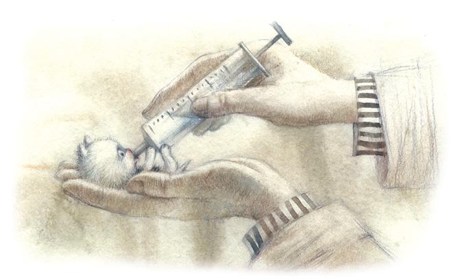 Стали кормить из шприца — верещал, скандалил, подвывал, хватал шприц двумя руками и двумя ногами, чтобы не отняли, высасывал содержимое с такой скоростью, что поршень сам сдвигался вниз, а нам оставалось только придерживать котёнка и шприц. Кот ел неаккуратно, чавкал, хлюпал, швыркал, молочная смесь заливала ему морду,