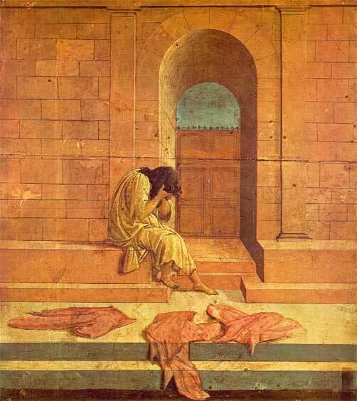 1495 год. Боттичелли пишет «Покинутую». Немая тишина… Может быть, миг тому назад площадка перед закрытыми дверями была полна движения. Молодая женщина рвалась, стучалась в замкнутые ворота. Металась по ступеням. Рвала на себе одежду. Кричала. Звала кого-то. Зловещее молчание воцарилось у массивных, сложенных из циклопических глыб стен. Победило отчаяние. Наступила безысходность.