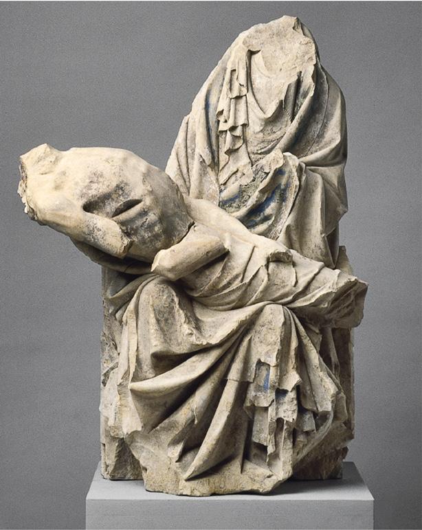 Рис. 11. Эта изуродованная статуя была найдена под кафедральным собором Берна в 1986 г. Кто-то (видимо, протестант-иконоборец) отбил голову Деве Марии и превратил тело ее мертвого Сына в обрубок без ног, рук и головы. Культ образов был упразднен в Берне в 1528 г. Сначала их вычистили из храмов. В 1533 г. меры были ужесточены: горожанам запретили держать статуи из дерева или камня даже дома. Исключение было сделано только для картин. Но им тоже нельзя было поклоняться. Год спустя власти распорядились их конфисковать, чтобы пресечь саму возможность идолопоклонства.