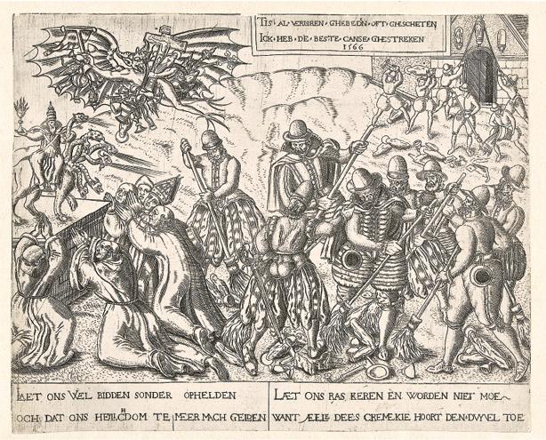 Рис. 12. Перед нами протестантская гравюра, созданная во время антииспанского восстания, вспыхнувшего в Нидерландах в 1566 г. Вдали кальвинисты сбрасывают с фасада церкви статуи и разбивают их на куски. На переднем плане они выметают идолопоклоннический сор: статуи святых, распятия, чаши для евхаристии и другие атрибуты католического культа. Слева клирики-«паписты» поклоняются папе, который, словно вавилонская блудница, восседает на семиглавом звере, символизирующем дьявола. Над ним парит демон. Он пытается спасти те же статуэтки, кресты, реликварии для мощей, монстранцы для гостий и т.д. В его левой руке — распятие, которое, вероятно, уже подверглось атаке иконоборцев. У Христа нет головы, левой руки и части торса. В подписи, сопровождающей гравюру, князь тьмы признает, что его власти пришел конец.