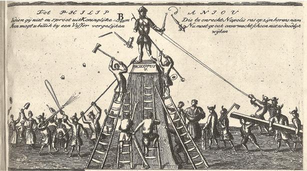 Рис. 13. Карл II (1665–1700), последний испанский король из династии Габсбургов, завещал корону Филиппу, герцогу Анжуйскому — внуку французского короля Людовика XIV. Он взошел на престол под именем Филиппа V. Однако Габсбурги, правившие в Священной Римской империи, отказались признать утрату былых владений. Так началась Война за испанское наследство (1701–1714). В 1707 г. имперские войска овладели Неаполем, который тогда принадлежал Испании. После этого в городе свергли конную статую Филиппа V. Она была установлена всего за пять лет до того в честь визита монарха. На этой нидерландской гравюре памятник изображен предельно условно — без коня. Мы видим, как неаполитанцы молотами и крюками отбивают королю руки, кто-то стреляет в истукана из мушкета, а толпа ликует.