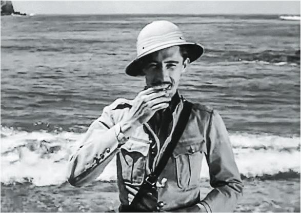 Однажды там устроили кинопоказ. Крутили американский фильм «Ураган» (режиссер Джон Форд, 1937). В основе его сюжета лежало противостояние между смелым полинезийцем Теранги и суровым губернатором-французом. В зале собрались обитатели лагеря и советские солдаты. «В героях фильма они видели не бесплотных персонажей, а друзей и врагов из плоти и крови, и эти друзья и враги были от них в двух шагах. Каждый поступок моряка зрители приветствовали оглушительным "ура", опасно размахивая вскинутыми над головой автоматами; полицейских и тюремщиков осыпали страшными проклятьями, кричали им "Катись отсюда!", "Чтоб ты сдох!", "Долой!", "Не тронь его!". Когда после первого побега раненого, обессиленного моряка снова заковали в цепи и над ним с язвительной ухмылкой начал глумиться Джон Кэррадайн (исполнявший роль надзирателя. — М.М.), зал взорвало. Возмущенная публика истошно кричала, защищая невиновного; грозная толпа мстителей ринулась к экрану, их, в свою очередь, поносили и пытались остановить менее горячие из зрителей, которые хотели узнать, чем кончится дело. В полотно экрана полетели камни, комья земли, обломки дверей, кто-то, негодуя, даже запустил в экран ботинком и угодил точно между глаз ненавистному врагу, оказавшемуся как раз на переднем плане» (рис. 1) [1].