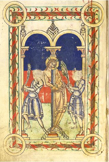 Рис. 2. В этой рукописи, вероятно принадлежавшей Роберту Молемскому, основателю цистерцианского ордена, кто-то выскоблил до дыр или вырезал головы двух воинов, которые бичуют Христа.
