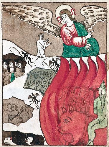Рис. 3. Ангел показывает душе умершего преисподнюю. В пламени на огромном звере сидит Сатана. Он одновременно повелитель ада и его узник — его ноги и руки за спиной связаны. Кто-то из читателей оставил у него лице дырку, через которую виден следующий лист.
